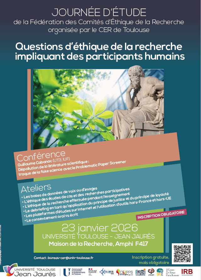 | Journée d'étude de la fédération des CER "Questions d'éthique de la recherche impliquant des participants humains" 23 janvier 2026 - 23 janvier 2026 |